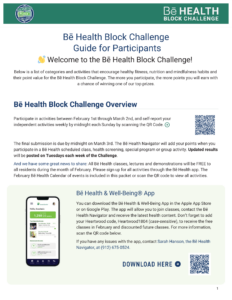 Get ready to prioritize your well-being! Today marks the official start of the Be Health Block Challenge, a month-long journey dedicated to healthy fitness, nutrition, and mindfulness habits. From now through March 2nd, every healthy choice you make earns you points and a chance to win one of our top prizes.