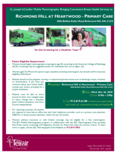 As part of their ongoing efforts to aid in earlier detection of breast cancer, the Mary Telfair Women’s Hospital at St. Joseph’s/ Candler is bringing their Mobile Mammography Bus to the Saint Joseph’s / Candler Heartwood Campus for onsite screenings on November, 26 2025. See more information in the flyer below. Call today to secure your spot  912-819-6140.